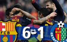 El Barcelona se impuso este domingo al Getafe por 6-1, en partido de la 23ª jornada de la liga española, que el equipo catalán continúa liderando con comodidad, con 12 puntos de ventaja sobre el Atlético de Madrid, que jugará este domingo contra el Rayo Vallecano.